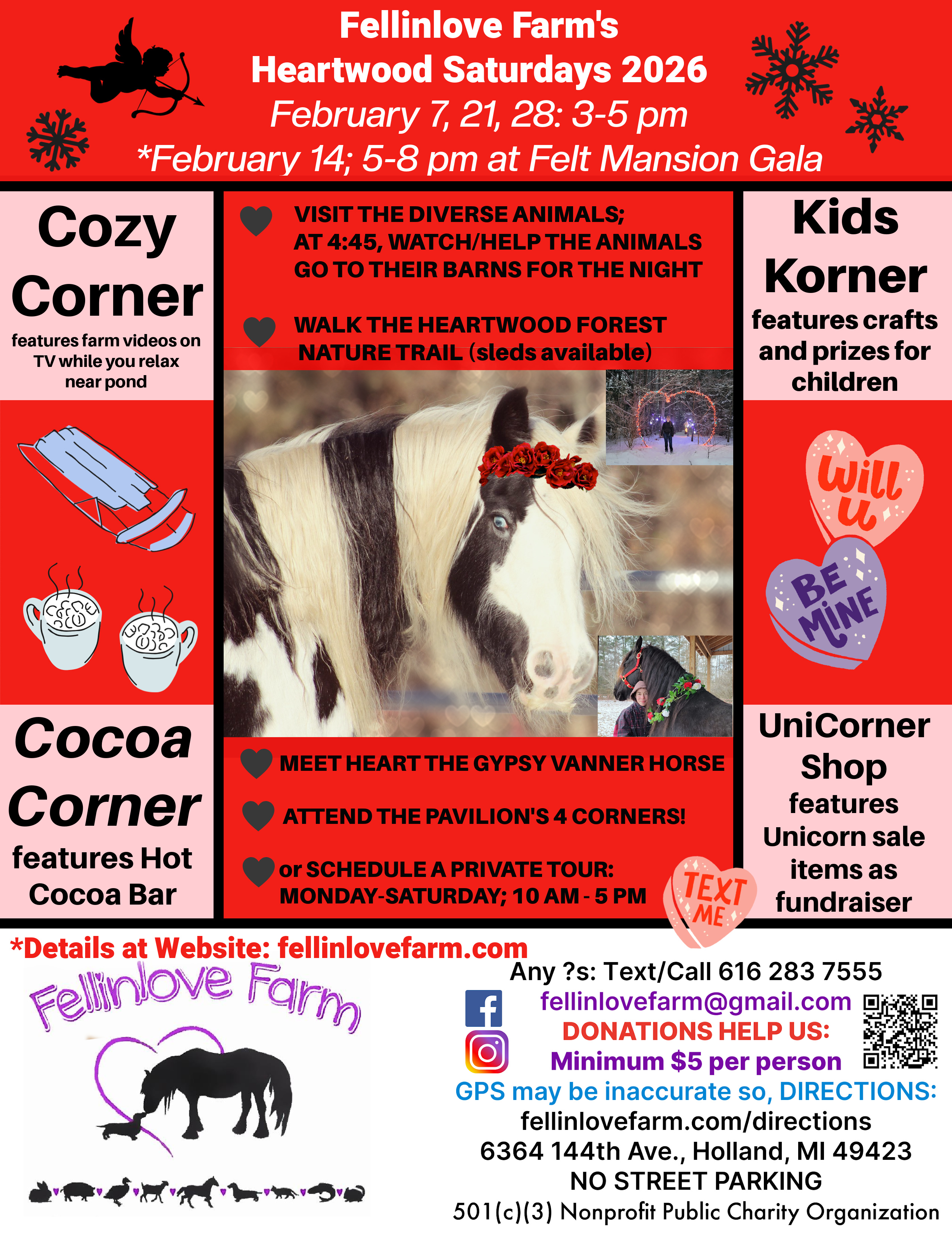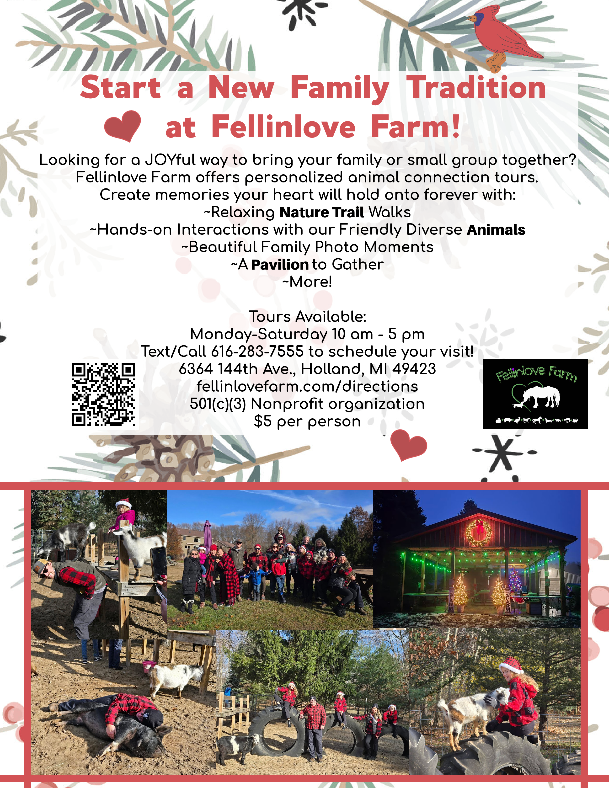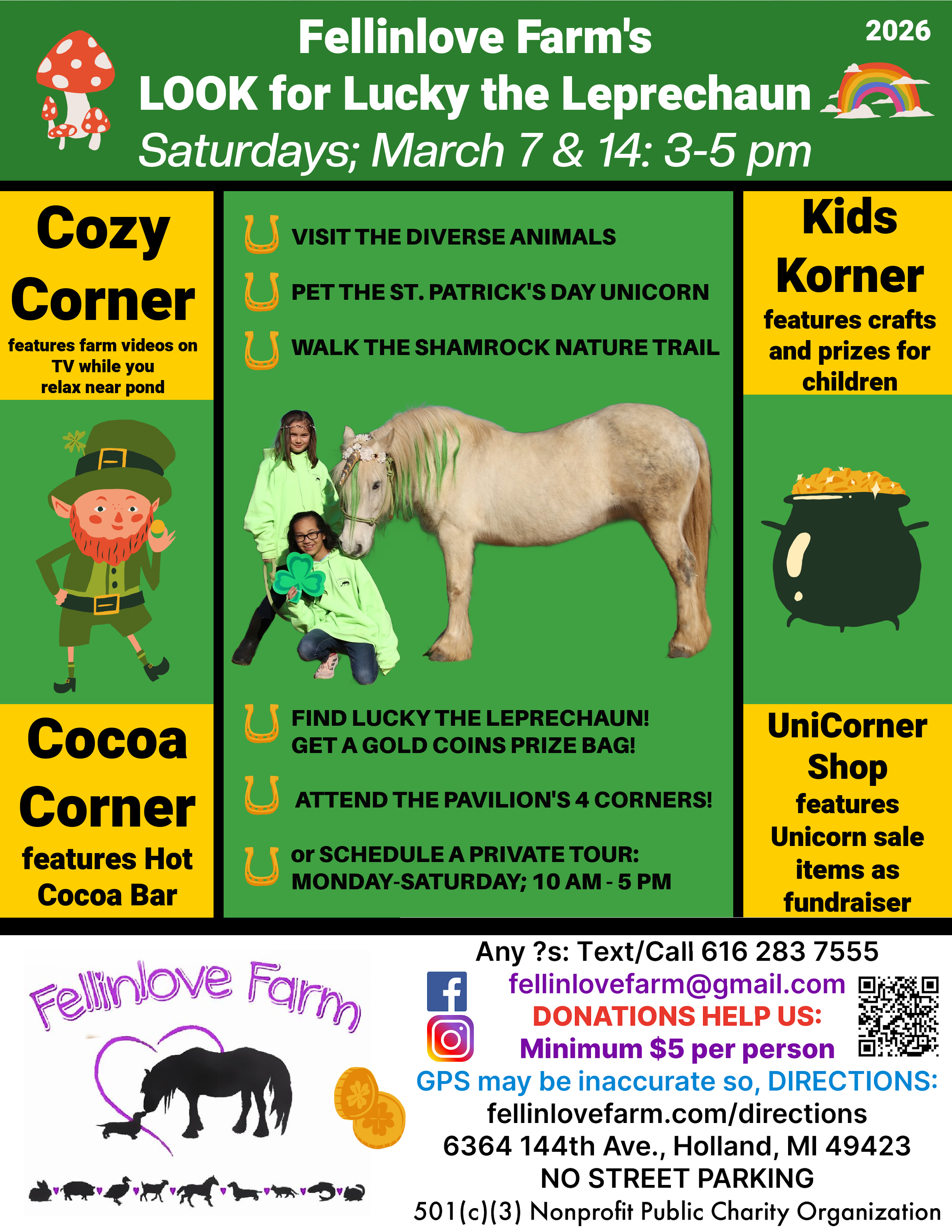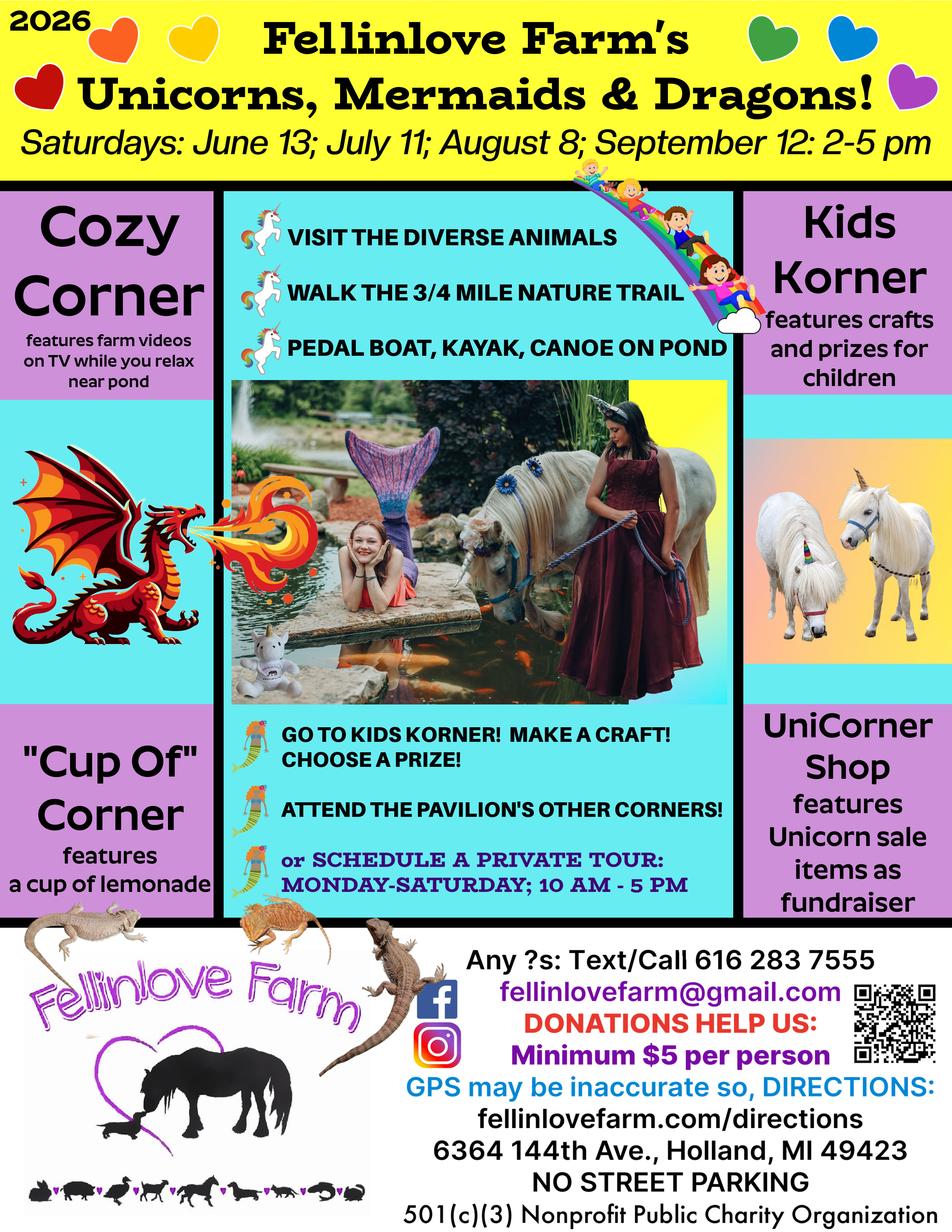 Fellinlove Farm is a 501(c)(3) nonprofit organization (public charity) we provide outdoor activities, socialization and educational opportunities by hands-on animal interactions. We have welcomed a significant increase in providing individualized field trips, tours, volunteer work opportunities and community programs. Our continued success depends on collaborations and donors. Together we can help more people "Experience the JOY"!