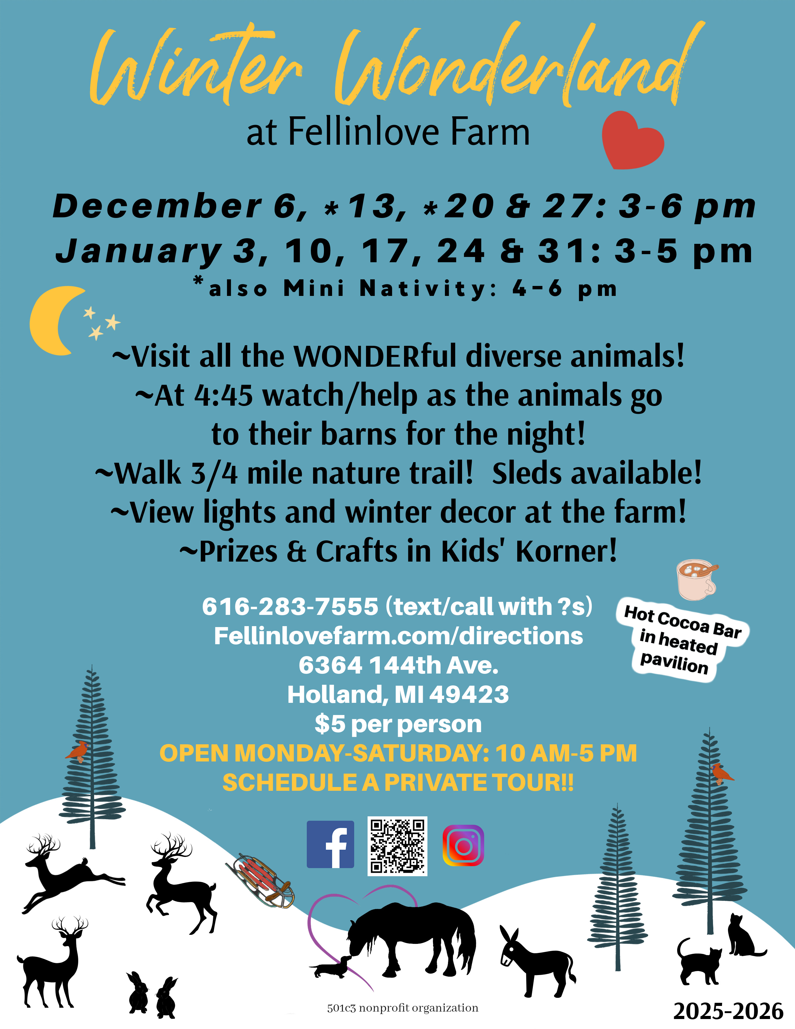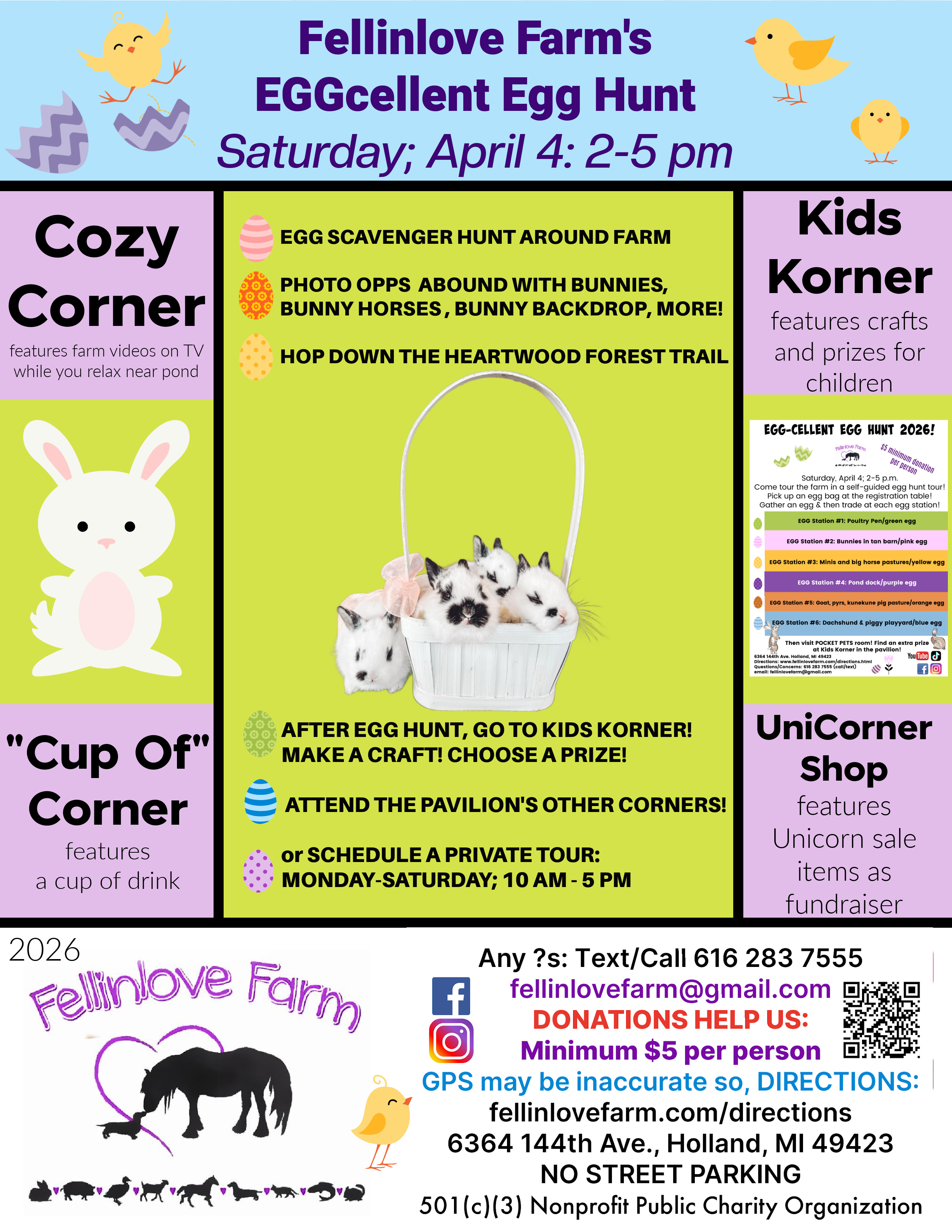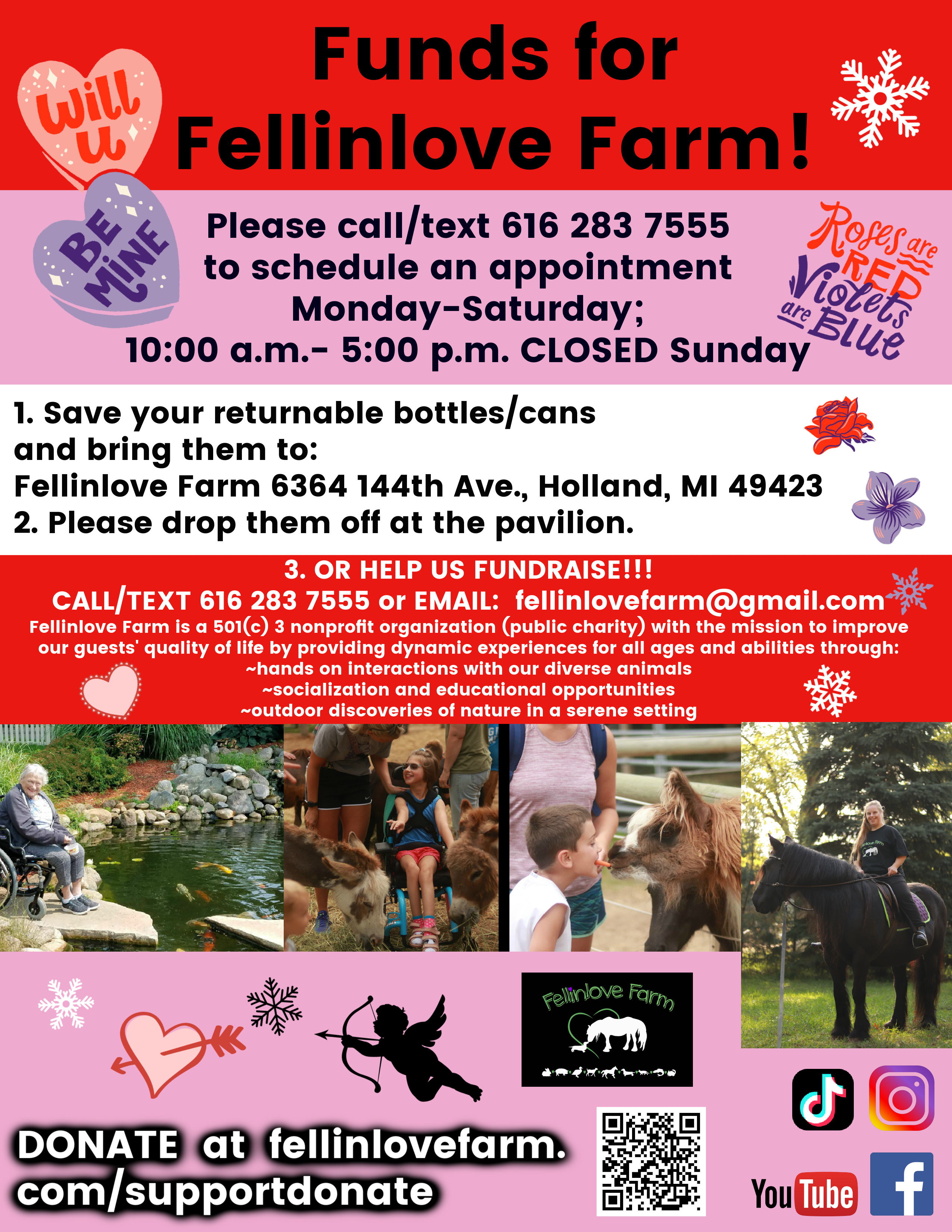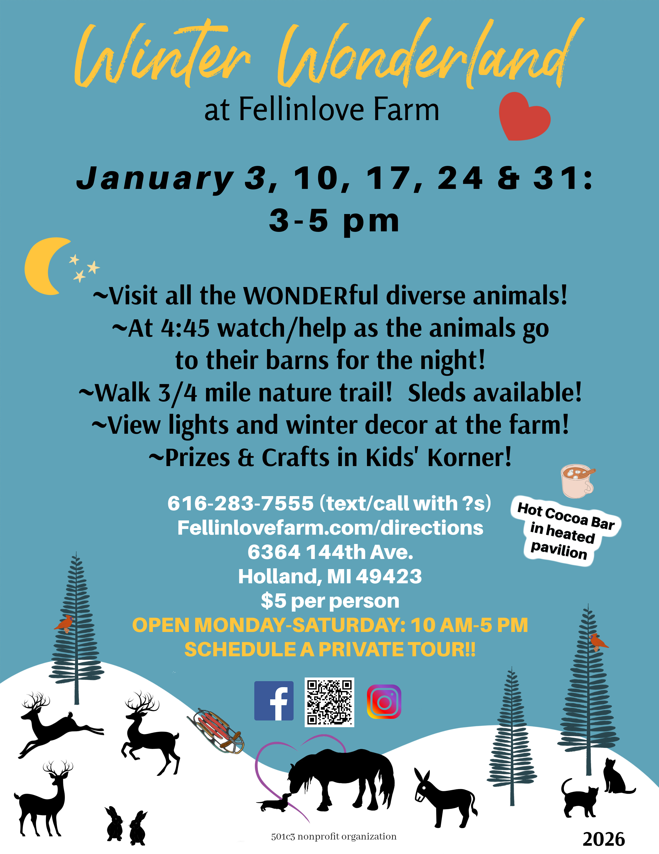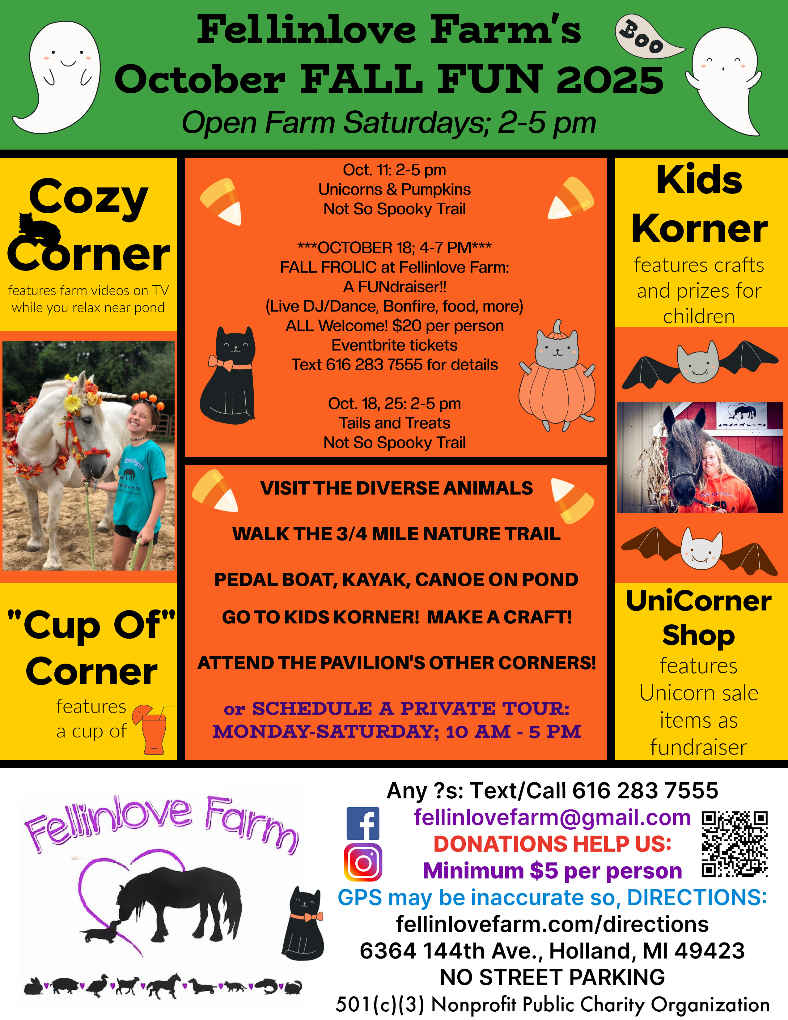 Fellinlove Farm is a 501(c)(3) nonprofit organization (public charity) we provide outdoor activities, socialization and educational opportunities by hands-on animal interactions. We have welcomed a significant increase in providing individualized field trips, tours, volunteer work opportunities and community programs. Our continued success depends on collaborations and donors. Together we can help more people "Experience the JOY"!
