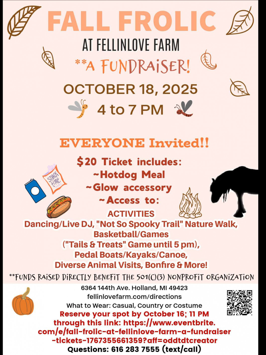 - Reserve Now: https://www.eventbrite.com/e/fall-frolic-at-fellinlove-farm-a-fundraiser-tickets-1767355661359?aff=oddtdtcreator (Copy & Paste in web browser) OR